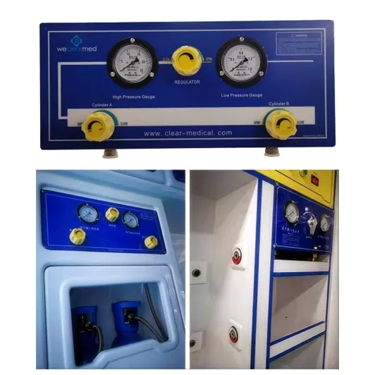 இந்த ஆம்புலன்ஸ் மருத்துவ எரிவாயு பன்மடங்கு அலகு அதிக ஆக்ஸிஜன் நுகர்வு கொண்ட ஆம்புலன்ஸ்களுக்கு ஏற்றது. இது மெட்டல் குழாய் வழியாக கட்டுப்பாட்டு குழு பிரதான குழாய் வழியாக பாட்டில் உயர் அழுத்த ஆக்ஸிஜனை உள்ளிடுகிறது, மேலும் உயர் அழுத்த ஆக்ஸிஜன் ஆக்ஸிஜன் முனையத்திற்கு குறைந்த அழுத்த குழாய் வழியாக மனச்சோர்வுக்குப் பிறகு முதலுதவி பயன்பாட்டிற்கு ஆக்ஸிஜன் மூலமாக பயன்படுத்தப்படுகிறது. ஆக்ஸிஜன் முனைய போர்ட் மற்றும் வென்டிலேட்டர் துறைமுகத்தை வழங்குவதற்காக, உயர் அழுத்த ஆக்ஸிஜனை குறைந்த அழுத்தமாக மாற்றி, அந்தந்த குழாய் வழியாக ஆக்ஸிஜன் முனையத்திற்கு வழங்குவதே பணிபுரியும் கொள்கை. கட்டுப்பாட்டுக் குழுவை ஒரே நேரத்தில் இரண்டு அல்லது அதற்கு மேற்பட்ட ஆக்ஸிஜன் சிலிண்டர்களுடன் இணைக்க முடியும், பாட்டில் உயர் அழுத்த ஆக்ஸிஜனை ஒரு குறிப்பிட்ட அழுத்தத்திற்கு குறைக்க முடியும், இது மையப்படுத்தப்பட்ட எரிவாயு விநியோகத்திற்கான ஒரு வகையான கருவியாகும். கட்டுப்பாட்டு குழு உலோகக் குழாய் செய்யப்பட்ட உயர் அழுத்தக் குழாயைக் கொண்டுள்ளது, இது ஜி 5/8 நூல்கள் மூலம் ஆக்ஸிஜன் சிலிண்டர்களுடன் இணைக்கப்பட்டுள்ளது. ஒவ்வொரு ஆக்ஸிஜன் சிலிண்டரும் கட்டுப்பாட்டு பேனலுடன் தொடர்புடைய உயர் அழுத்த மாறுதல் வால்வுடன் இணைக்கப்பட்டுள்ளது, இது அந்தந்த உயர் அழுத்தக் குழாயைக் கட்டுப்படுத்துகிறது. சுவிட்ச் வால்வின் பின்புற முனையில் ஒவ்வொரு ஆக்ஸிஜன் சிலிண்டரையும் இணைக்கும் உயர் அழுத்த குழாய் ஒருவருக்கொருவர் இணைக்கப்பட்டுள்ளது, மேலும் பன்மடங்கு பன்மடங்கின் நடுவில் ஒரு டீ இணைப்பான் பொருத்தப்பட்டுள்ளது, இது உயர் அழுத்த மீட்டர், சீராக்கி மற்றும் தொடரில் உயர் அழுத்த குழாய் ஆகியவற்றை இணைக்க. கட்டுப்பாட்டுக் குழுவின் உயர் அழுத்தக் குழாயில் ஆக்ஸிஜன் அழுத்தத்தை கண்காணிக்க உயர் அழுத்த மீட்டர் பயன்படுத்தப்படுகிறது, மேலும் உயர் அழுத்த ஆக்ஸிஜனை தேவையான அழுத்தத்திற்கு கட்டுப்படுத்தவும், பின்னர் குறைந்த அழுத்த முனையத்திற்கு வெளியீடு செய்யவும் சீராக்கி பயன்படுத்தப்படுகிறது. குறைந்த அழுத்த முடிவு ஆக்ஸிஜன் முனையம், பாதுகாப்பு வால்வு மற்றும் குறைந்த அழுத்த அளவீடு ஆகியவற்றுடன் இணைக்கப்பட்டுள்ளது, இது கட்டுப்பாட்டுக் குழுவின் குறைந்த அழுத்தக் குழாயில் அழுத்தத்தை கண்காணிக்கப் பயன்படுகிறது, அதே நேரத்தில் பாதுகாப்பு வால்வு தானாகவே வெளியீட்டு அழுத்தம் வடிவமைப்பு அழுத்தத்தை விட அதிகமாக இருக்கும்போது வாயுவை வெளியேற்றும், இதனால் வெளியீட்டு அழுத்தத்தின் பாதுகாப்பு மற்றும் நிலைத்தன்மையை உறுதி செய்கிறது. எரிவாயு அழுத்தம் மற்றும் எரிவா
