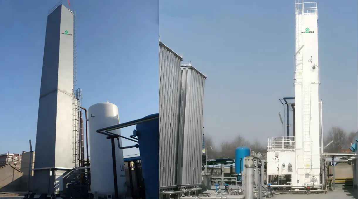 3. காற்று பிரிப்பு: ஒரு வடிகட்டுதல் நெடுவரிசையில், உயரும் வாயு மற்றும் கீழ்நிலை திரவம் ஒரு தட்டு அல்லது பொதி மீது வெப்பம் மற்றும் வெகுஜன பரிமாற்றத்திற்கு உட்படுத்தப்படுகின்றன; உயரும் வாயுவின் நைட்ரஜன் உள்ளடக்கம் அதிகரிக்கிறது, அதே நேரத்தில் கீழ்நிலை திரவத்தின் ஆக்ஸிஜன் உள்ளடக்கம் அதிகரிக்கிறது.